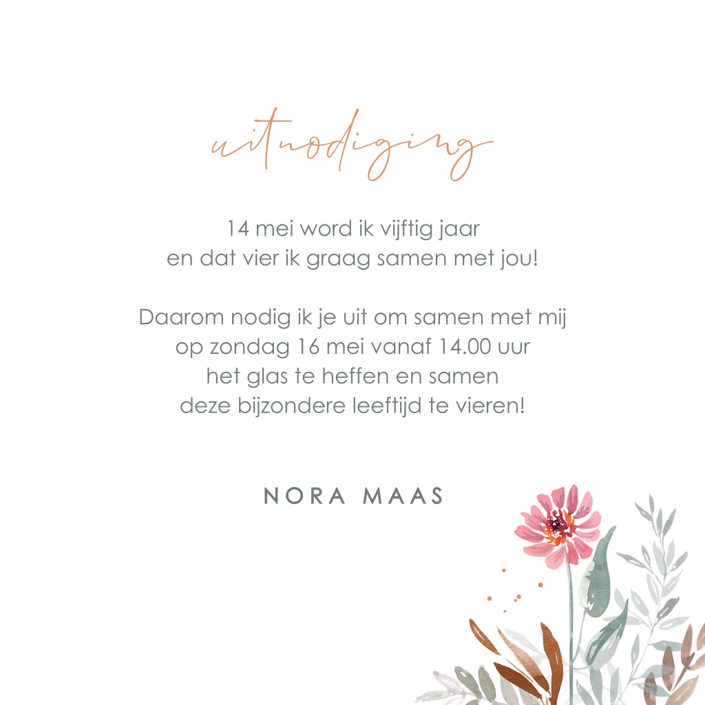 Vrolijke verjaardagsuitnodiging 50e verjaardag met bloemen en een foto van de jarige.