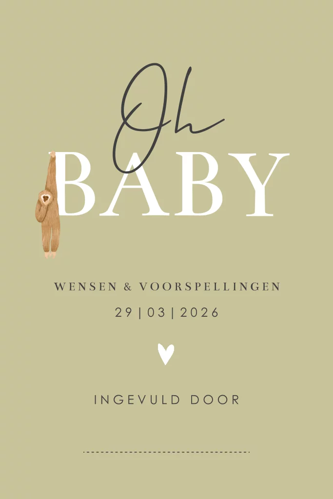 Organiseer jij binnenkort een babyshower en ben je op zoek naar een leuke activiteit? Met dit invulkaartje kun je gasten o.a. de naam, geboortedatum en gewicht van de baby laten voorspellen! Het kaartje heeft een mooie olijfgroene kleur en past perfect bij een jungle / dieren babyshower.