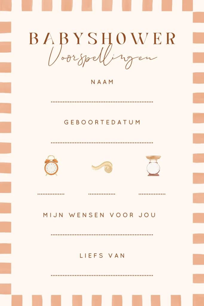 Organiseer jij binnenkort een babyshower en ben je op zoek naar een leuke activiteit? Met dit invulkaartje kun je gasten o.a. de naam, geboortedatum en het gewicht van de baby laten voorspellen!