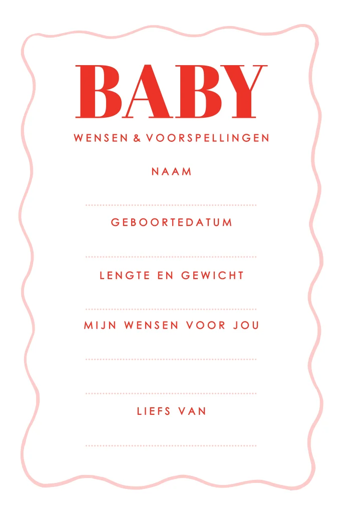 Organiseer jij binnenkort een babyshower en ben je op zoek naar een leuke activiteit? Met dit invulkaartje kun je gasten o.a. de naam, geboortedatum en gewicht van de baby laten voorspellen! Het kaartje heeft een toffe rood geruite achterkant en golvend kader, zo leuk!