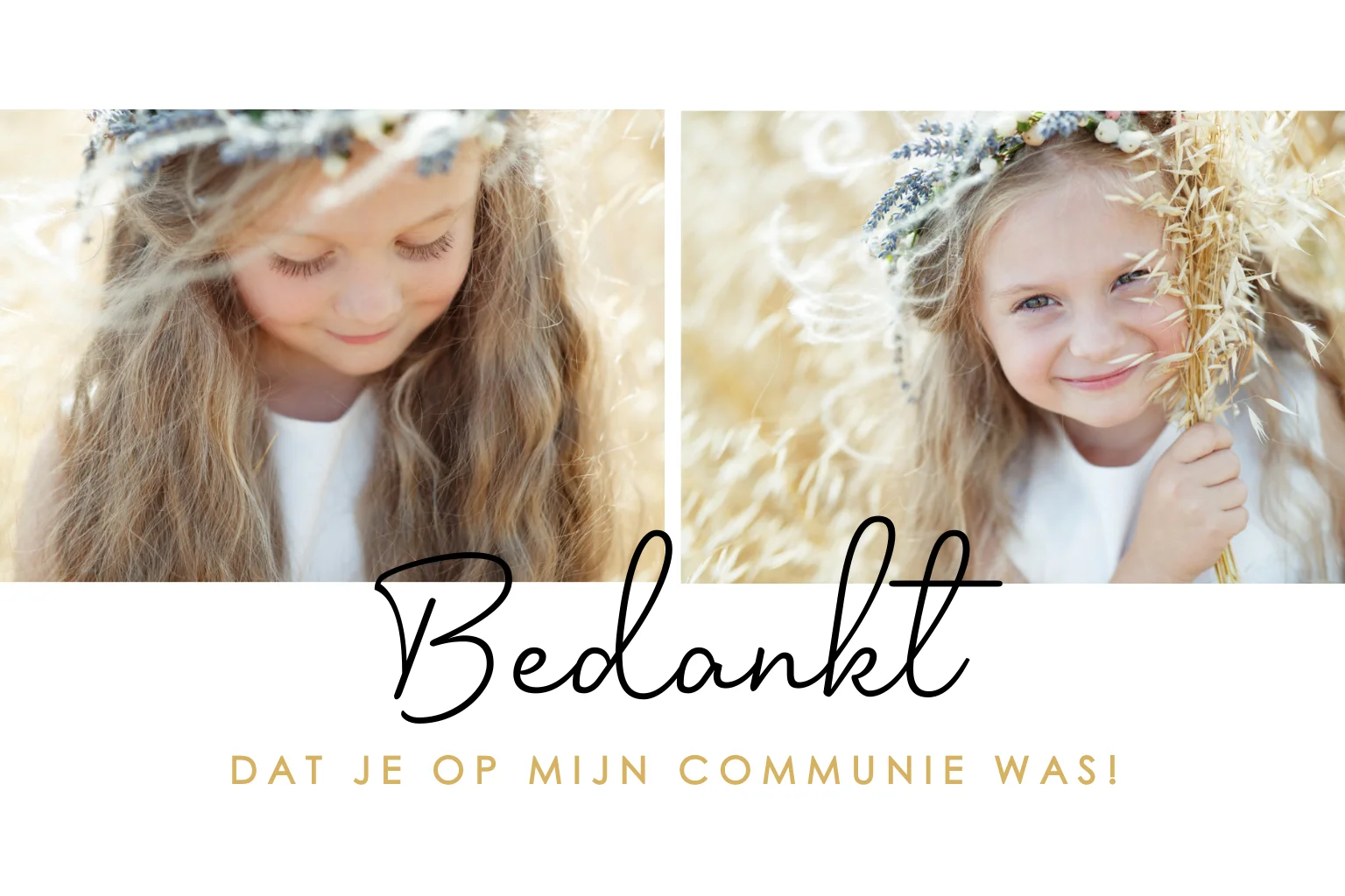 Een communie bedankkaartje is leuk om te versturen naar iedereen die op jouw speciale feest was. Leuk om foto's van die speciale dag toe te voegen aan deze kaart. Dat kan heel gemakkelijk via de upload knop.
