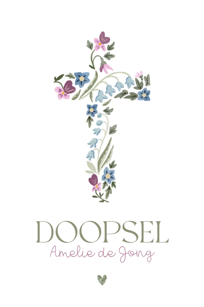 Zo mooi, dit doopkaartje met kruis van roze en blauwe bloemen! Maak eenvoudig een persoonlijke uitnodiging voor het doopsel van je dochtertje.