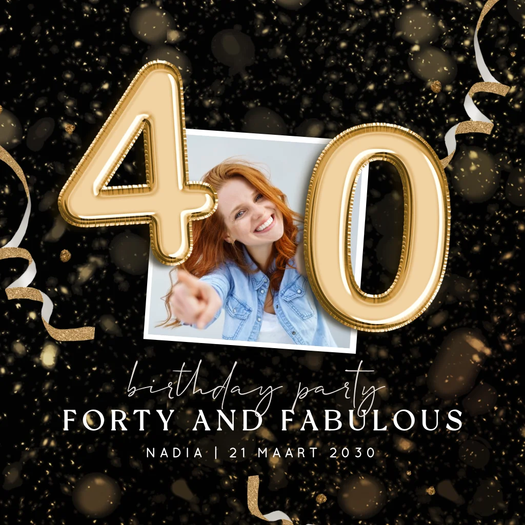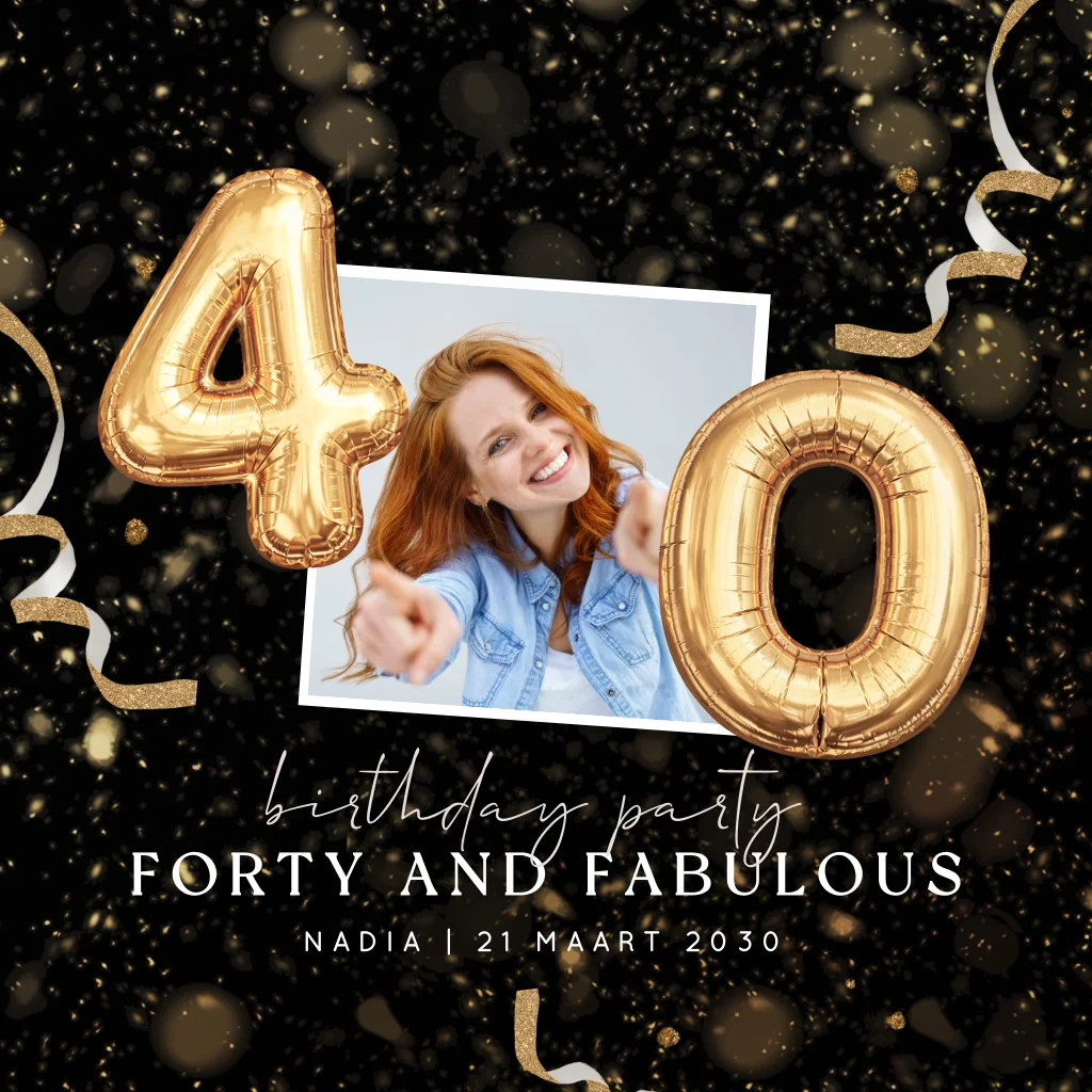 Feestelijke uitnodiging 40 jaar met foto en gouden ballonnen