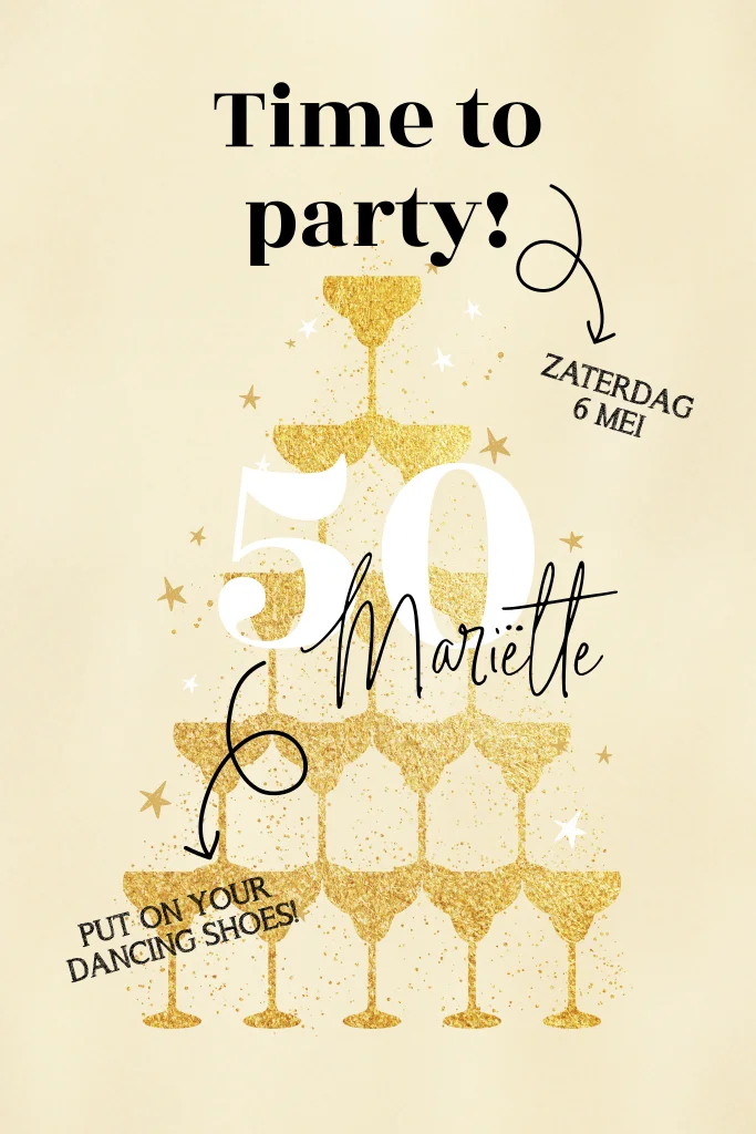 Hip en origineel deze uitnodiging voor een vijftigste verjaardagsfeest. Leuke typografie met gouden champagne toren!