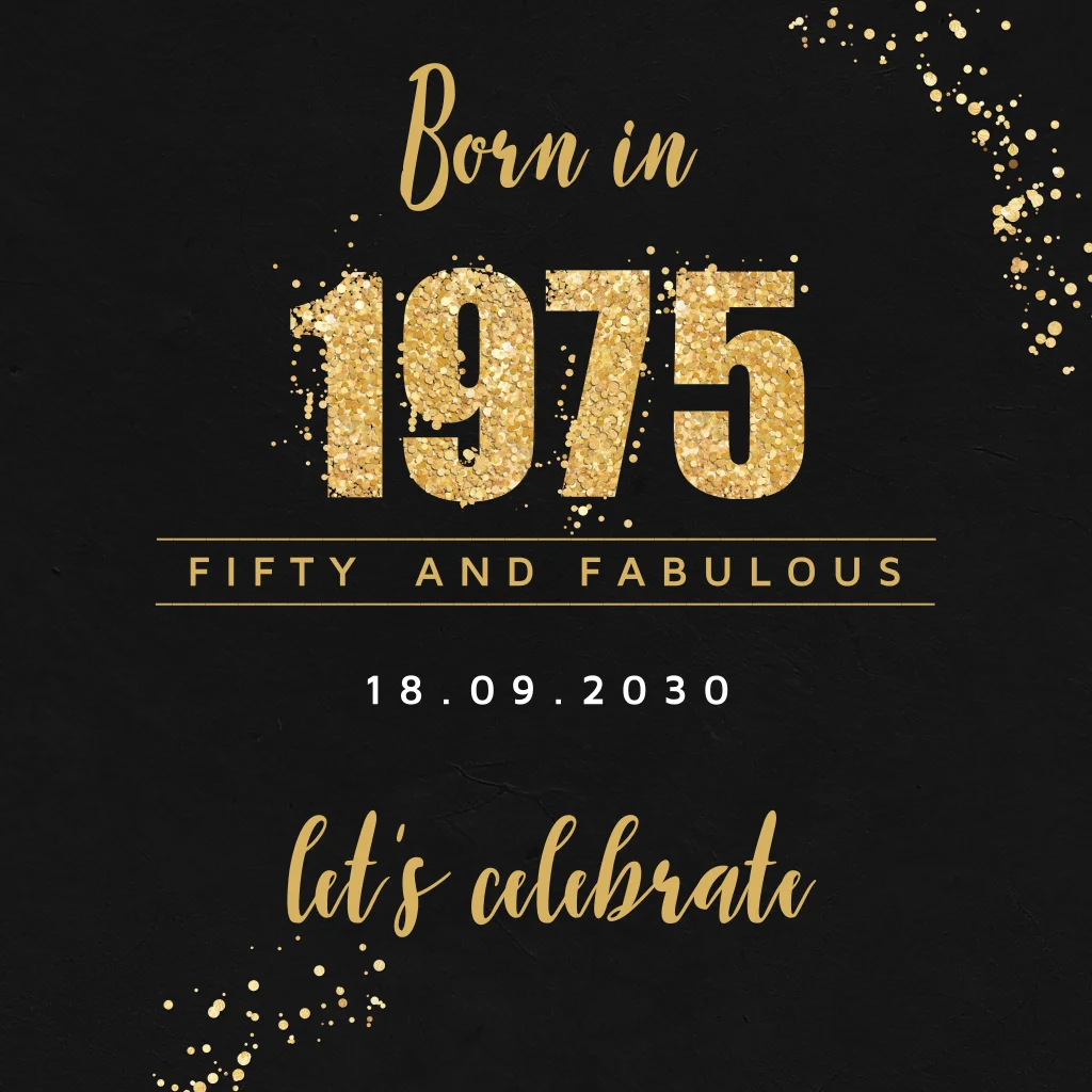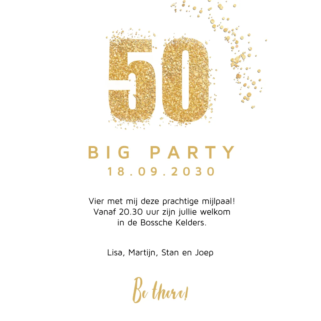 Feestelijke uitnodigingskaart verjaardag met geboortejaar in zwart wit met gouden spetters. Maak de uitnodiging compleet met een gouden envelop.