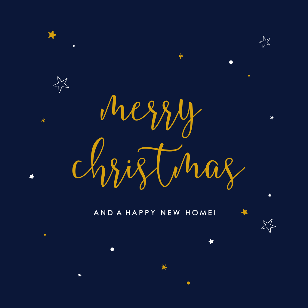 Stijlvol kerst verhuiskaartje in sfeervolle blauwe kleur met sterretjes om familie en vrienden fijne kerstdagen te wensen. Extra feestelijk op parelmoer papier.