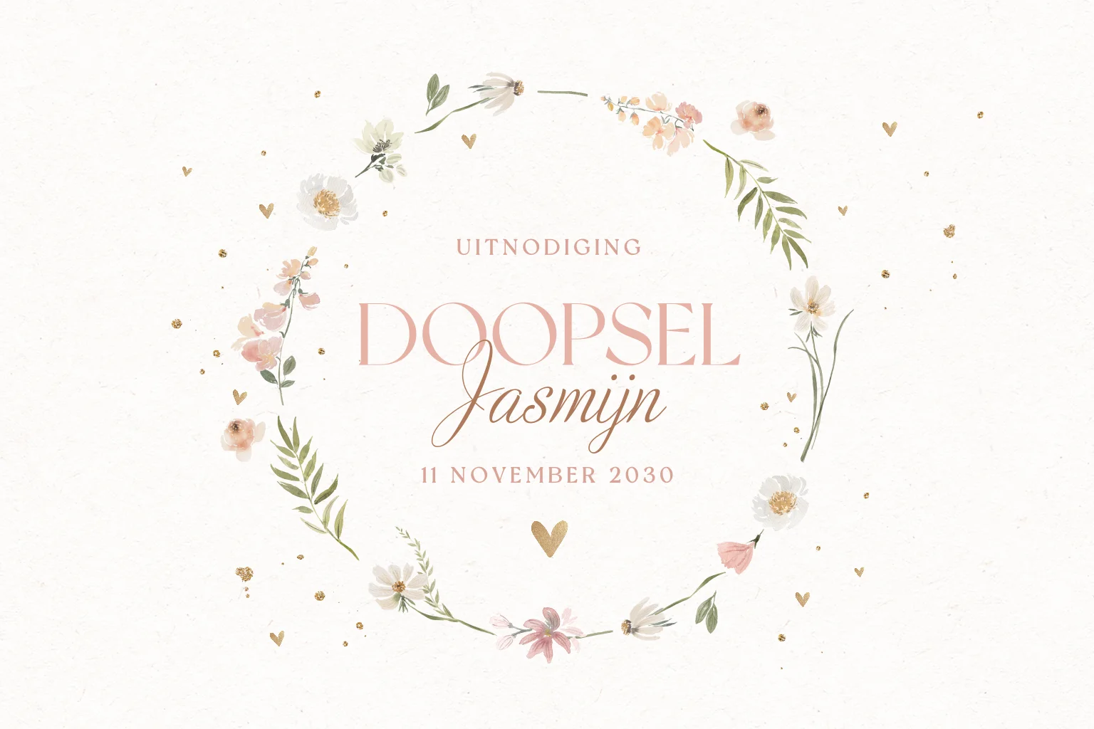 Een prachtig doopkaartje met bloemenkrans in roze tinten en lieve hartjes. Pas de kaart naar wens aan in onze online editor.