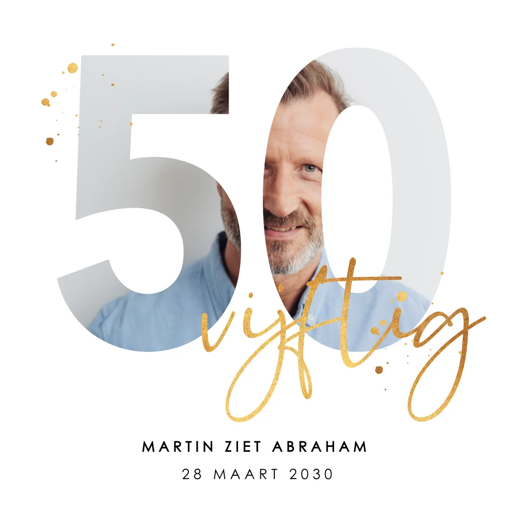 Uitnodiging voor een 50e verjaardag met origineel fotomasker. De kleurencombinatie wit en goud zorgt voor een extra feestelijke look bij deze uitnodiging. Dit samen met het stijlvolle lettertype maakt de uitnodiging helemaal af.