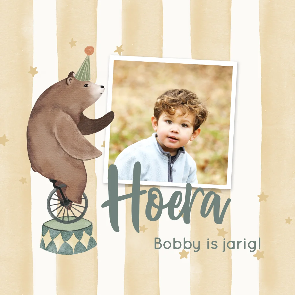 Een vrolijke uitnodiging kinderfeestje met beer en olifant in circus thema. De foto op de voorzijde vervang je gemakkelijk zelf in onze editor voor een eigen foto! Maak zo eenvoudig je persoonlijke verjaardagsuitnodiging.