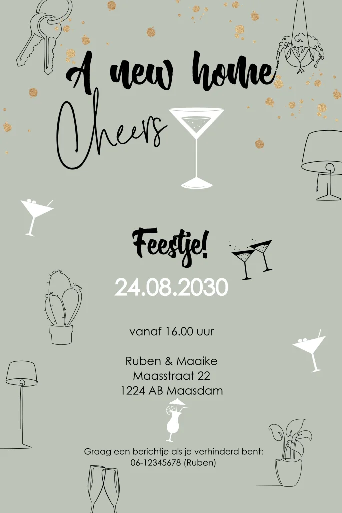 Uitnodiging om jullie nieuwe woning te bekijken met vrolijke drankjes, planten en lampen op een groene achtergrond.