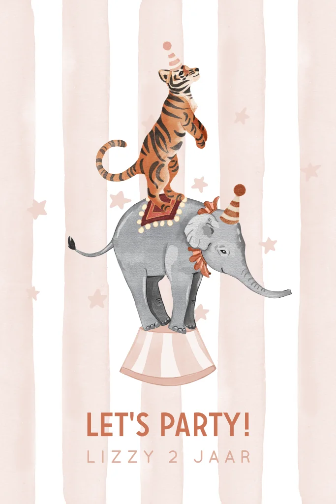 Een vrolijke uitnodiging verjaardag met dieren. De kleur van de strepen kunnen in onze editor aangepast worden. Maak zo je persoonlijke verjaardagsuitnodiging.