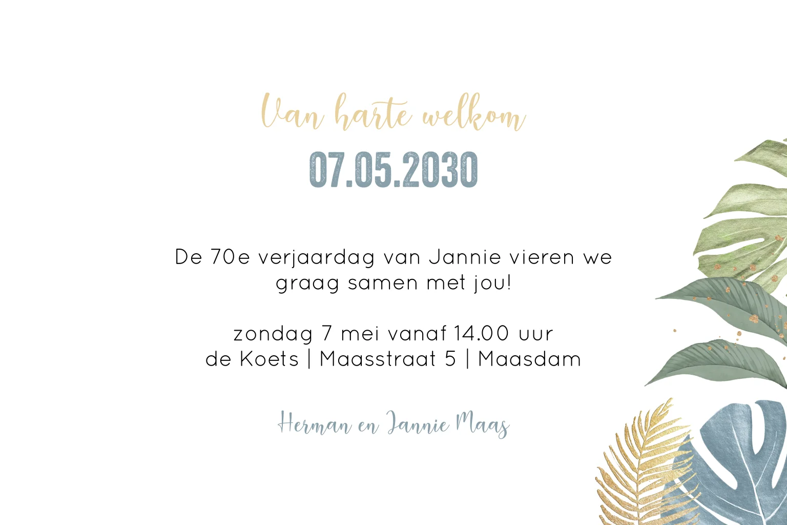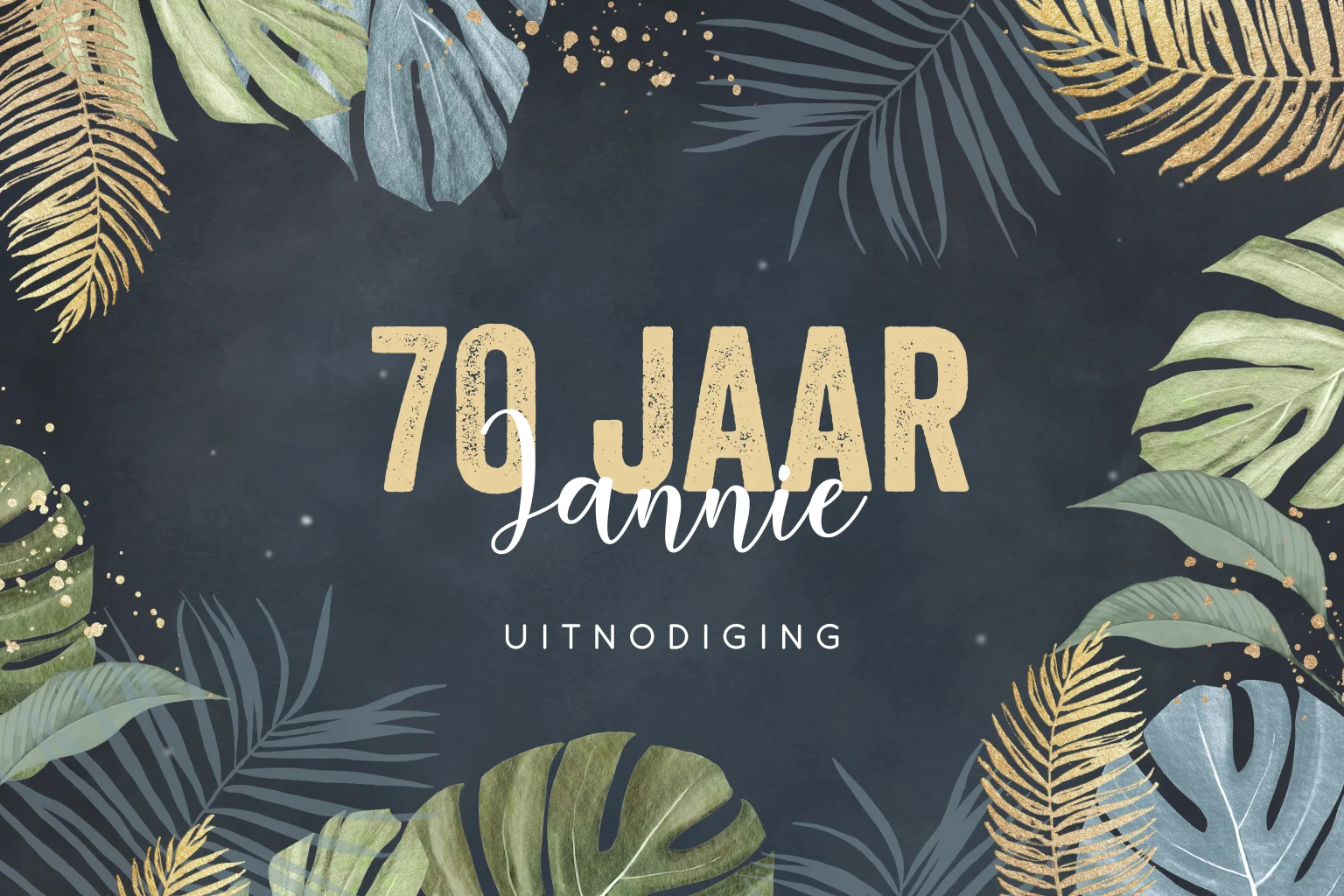 Originele uitnodiging verjaardag met jungle bladeren en takjes.
