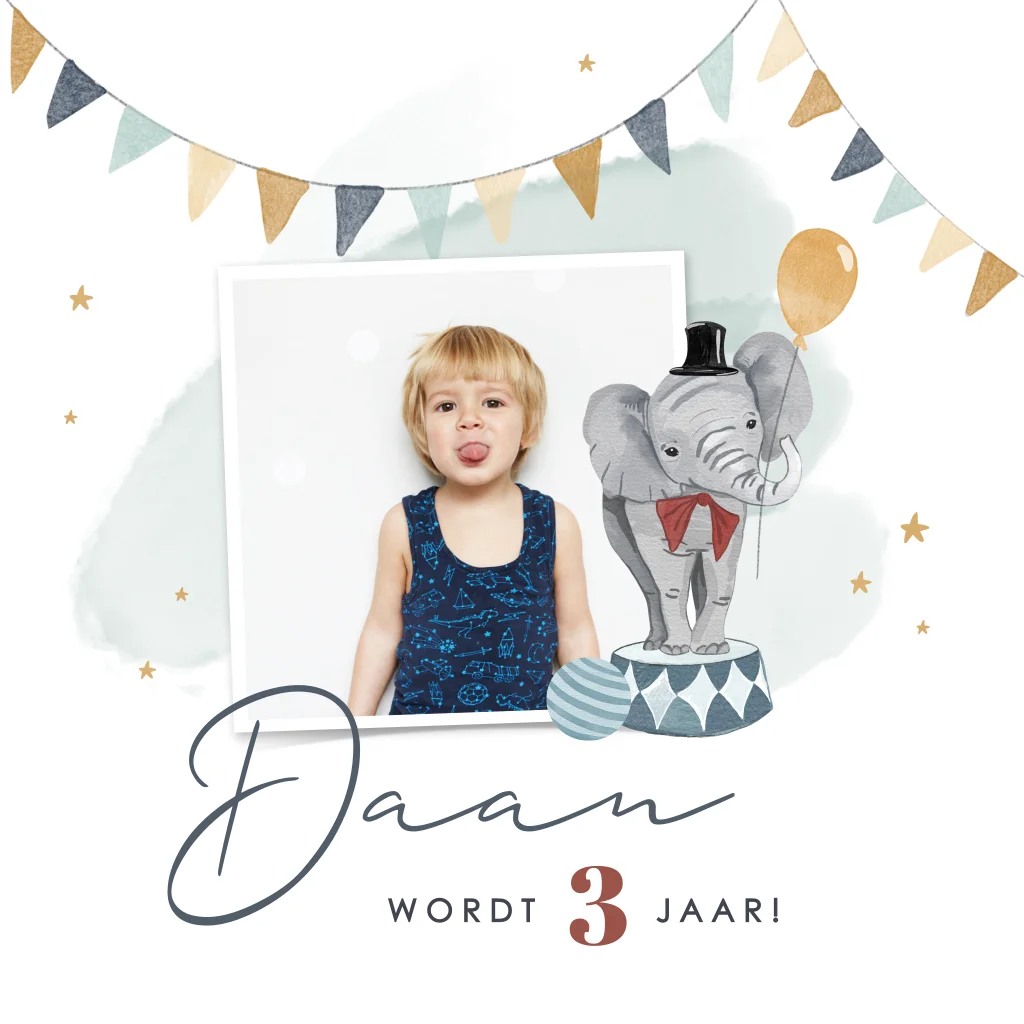 Een vrolijke verjaardagsuitnodiging met olifant, slingers en ballonnen. Op de voorzijde kun je je eigen foto uploaden. Maak zo eenvoudig je persoonlijke uitnodiging kinderfeestje.