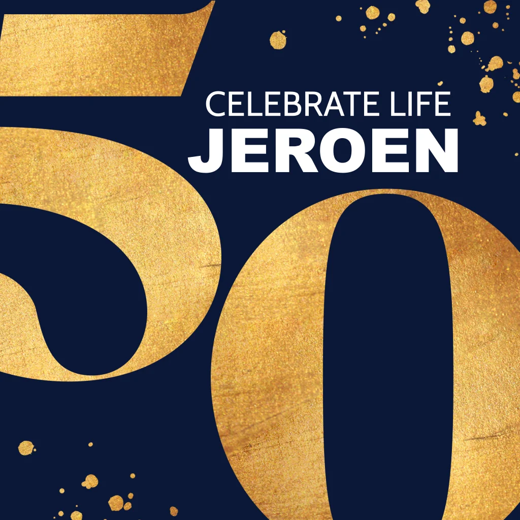 Verjaardagsfeest uitnodiging met gouden cijfer 50 en spetters. Origineel en hip. Maak de uitnodiging compleet met gouden envelop.