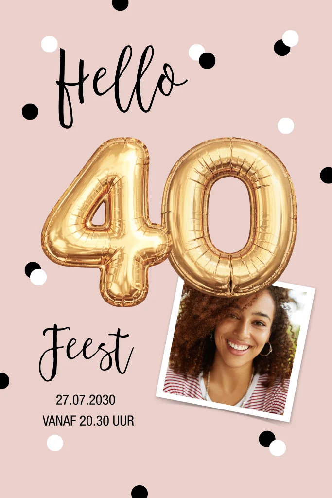 Vrolijke uitnodiging voor je veertigste verjaardag. Op de voorzijde is er ruimte voor een eigen foto, maak zo eenvoudig je persoonlijke uitnodiging.