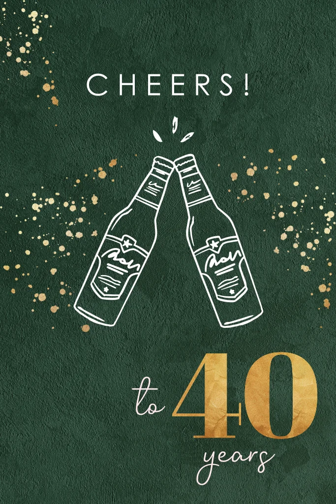 Stijlvolle uitnodiging 40 jaar in groen met bierflesjes en goudspetters