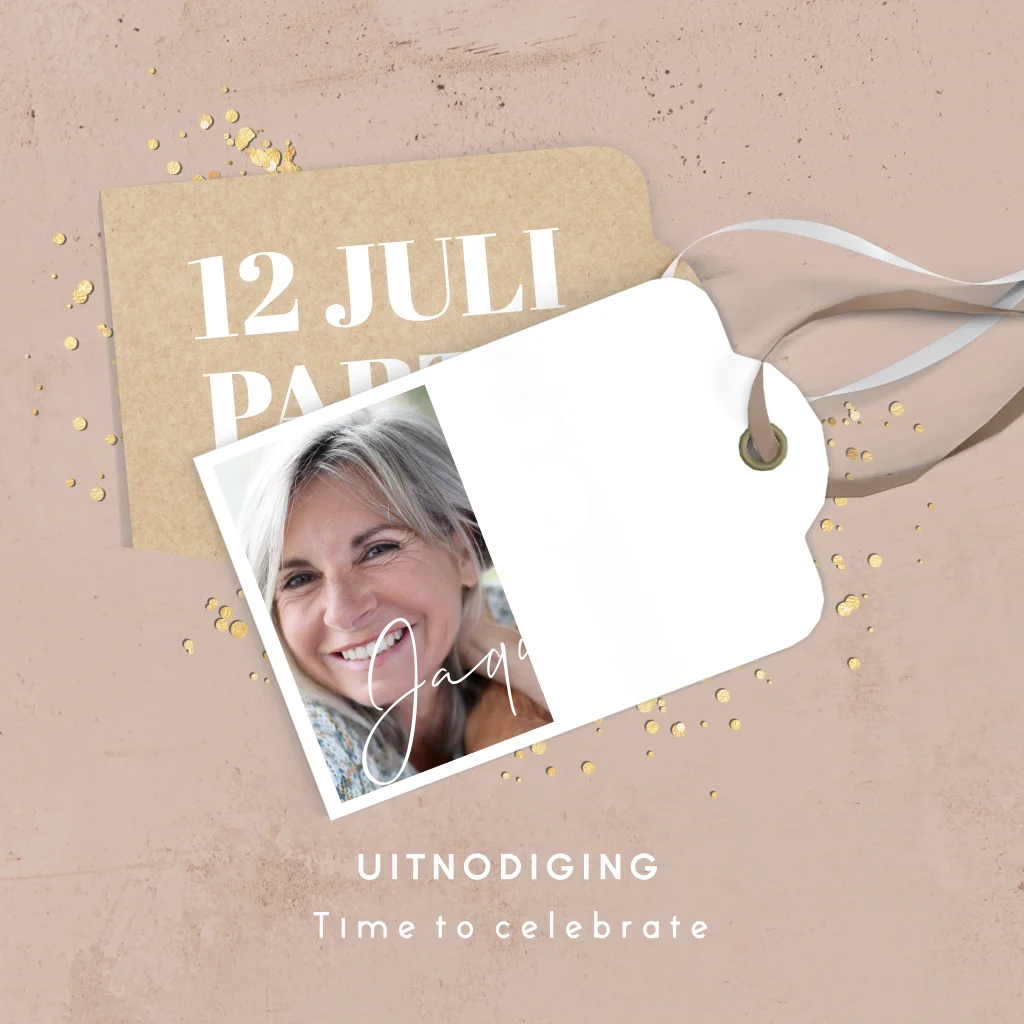 Verjaardag uitnodiging met foto en beige achtergrond. De mat goudfolie geeft de kaart een extra feestelijke uitstraling.
