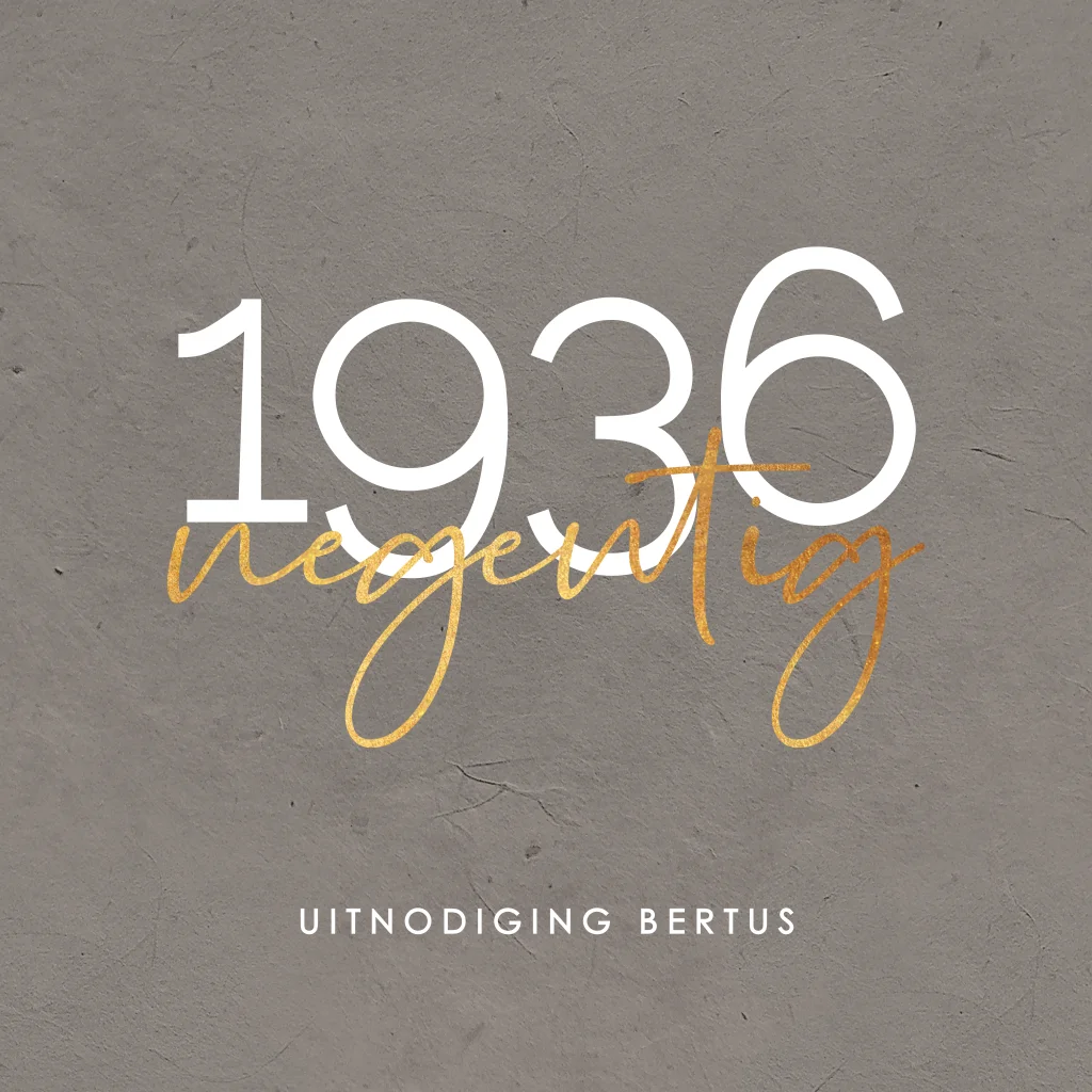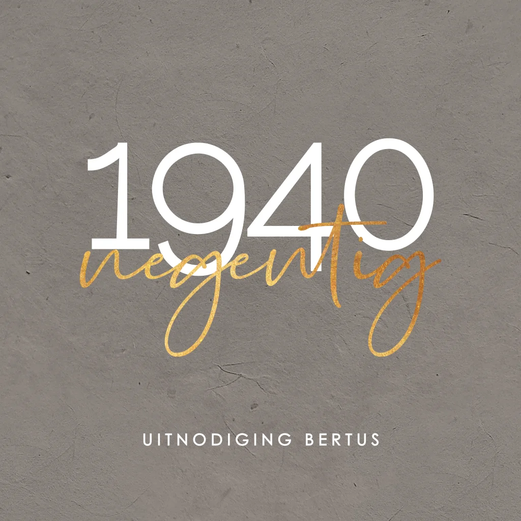 Stijlvolle verjaardagsuitnodiging voor 90ste verjaardag. De goudkleurige letters komen mooi naar voren op de grijze achtergrond!
