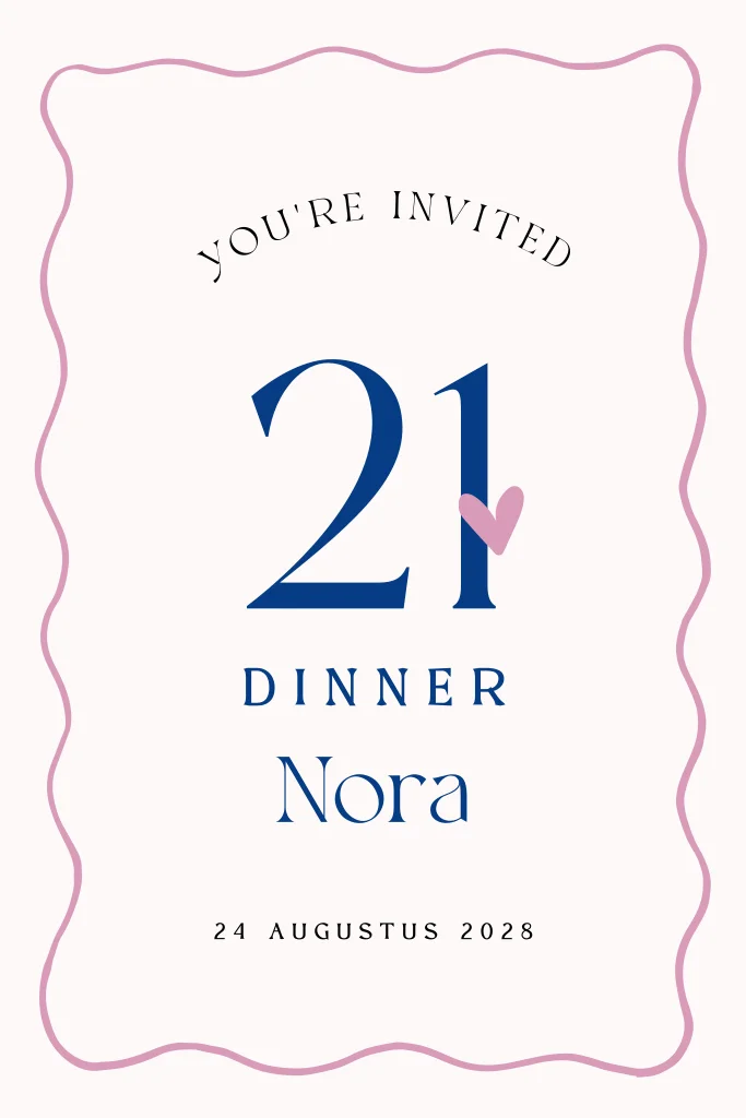 Nodig je vrienden en vriendinnen uit voor je 21 diner met deze super cute 21 diner uitnodiging! Pas gemakkelijk lettertypes, kleuren en andere elementen aan met de online editor.
