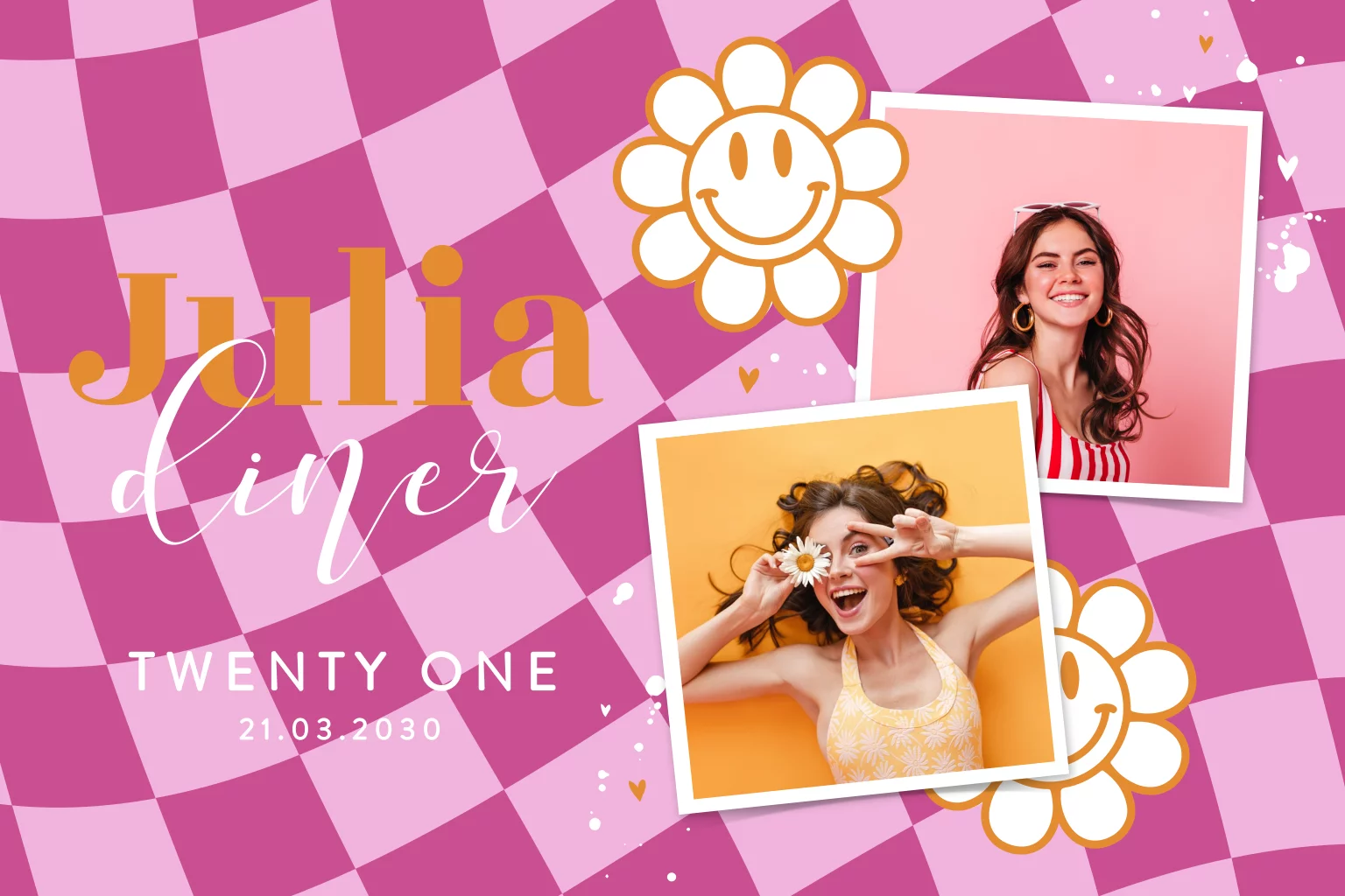 21 baby! Vier je 21 diner met deze roze retro uitnodigingen met smiley bloemen. Maak de kaart helemaal af met je eigen foto's.