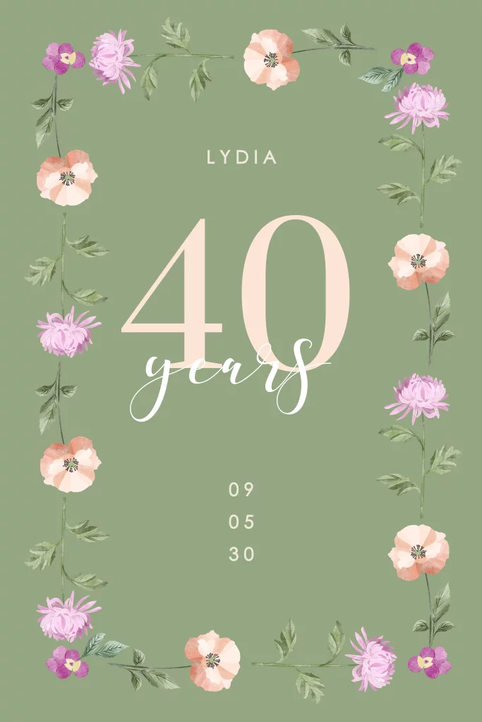 Uitnodigingskaart 40e verjaardag met kleurrijke bloemenkrans.