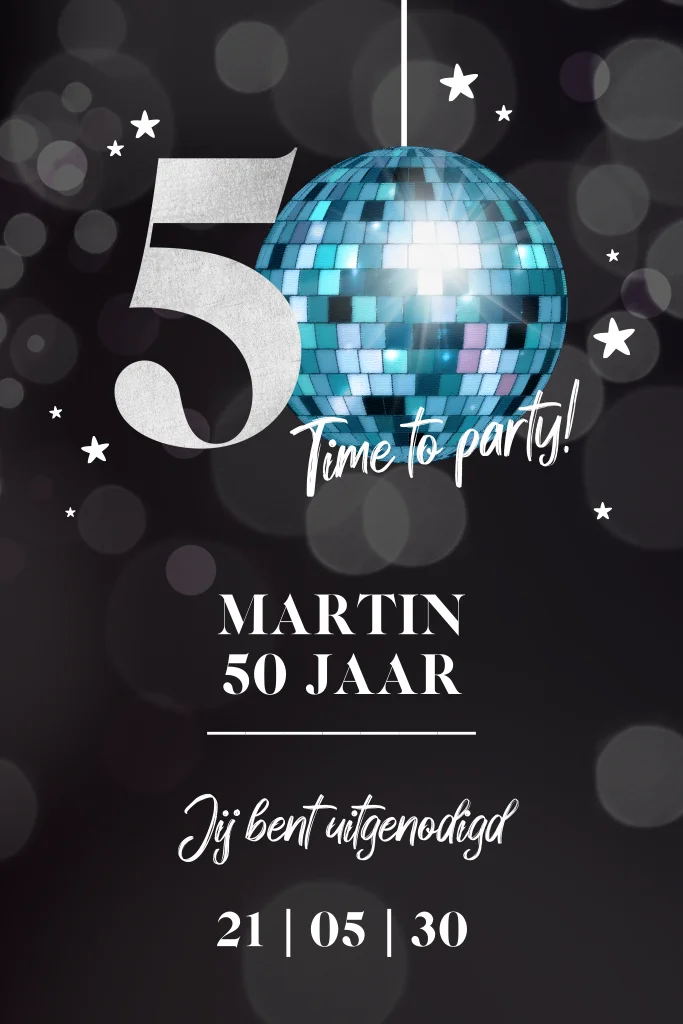 Nodig familie en vrienden uit voor een spetterende discoparty ter ere van je 50ste verjaardag met deze feestelijke kaart. Op een zwarte achtergrond zie je de weerschijn van de blauwe discobal, de nul van het cijfer vijftig. De sterretjes er omheen maken het extra vrolijk, voetjes van de vloer!
