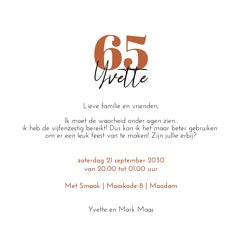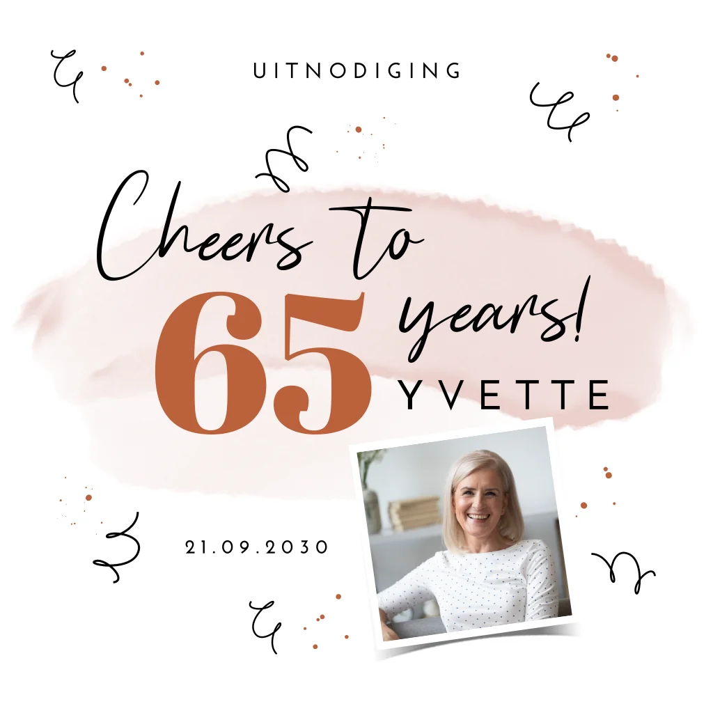 Cheers op het leven! Een super originele uitnodiging voor een 65e verjaardag. Persoonlijk met een foto van de jarige op de voorzijde.