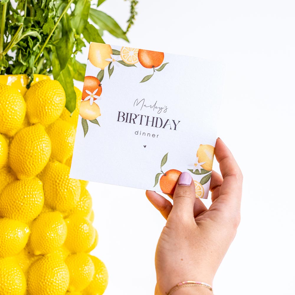 Wat een kleurrijke uitnodigingskaart voor een dinnerparty, je krijgt meteen zin in het feestje! De gele citroenen en de oranje sinaasappels met groene blaadjes maken dit een vrolijke kaart. De tekst staat in trendy lettertype en een klein hartje eronder zorgt voor een lief accentje.