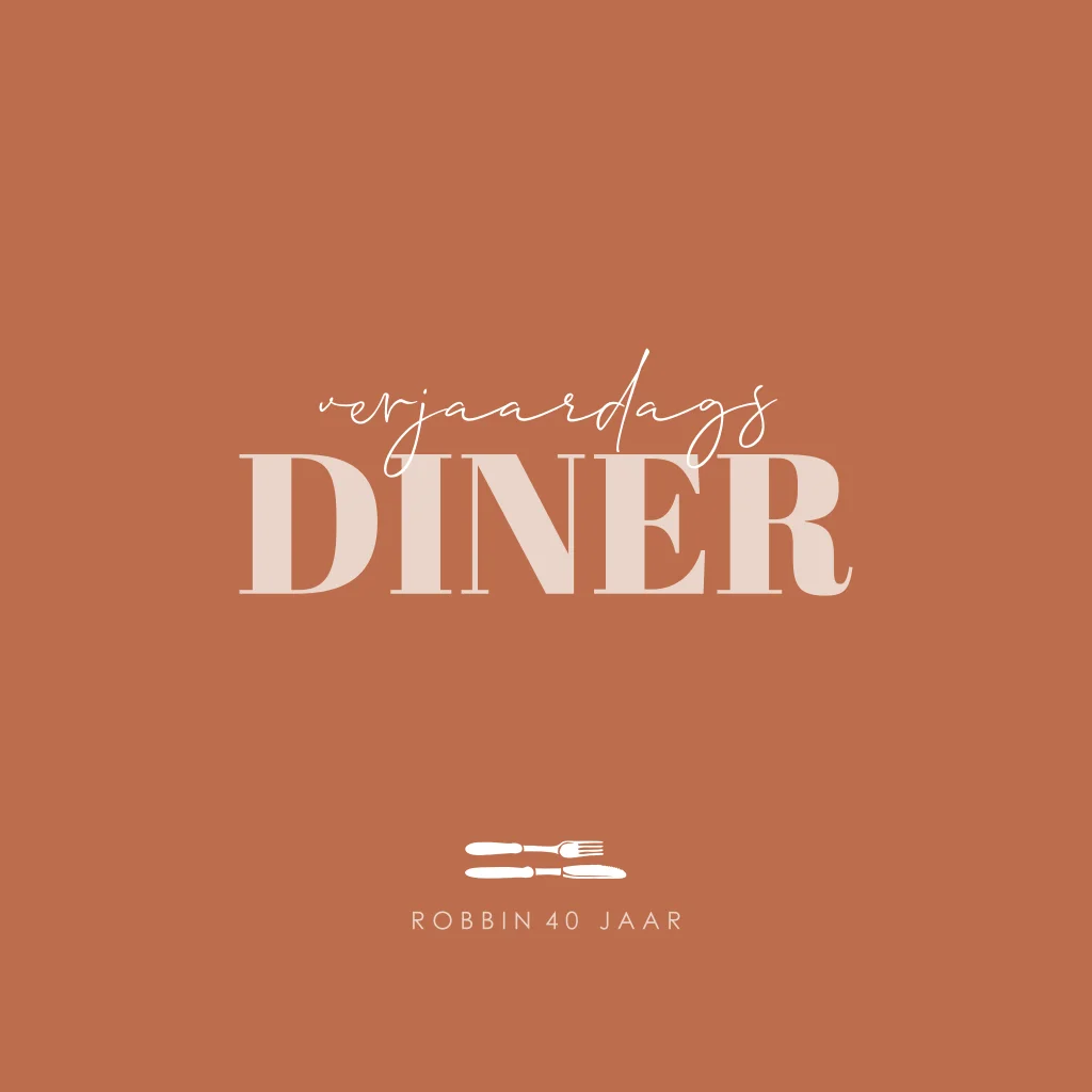 Minimalistisch design uitnodigingskaart voor een dinner party ter ere van je verjaardag: op een roestbruine achtergrond staat de tekst in wit in verschillende lettertypen, eronder een kleine illustratie van bestek. Een stoere uitnodiging waarbij de tekst meteen de aandacht trekt!