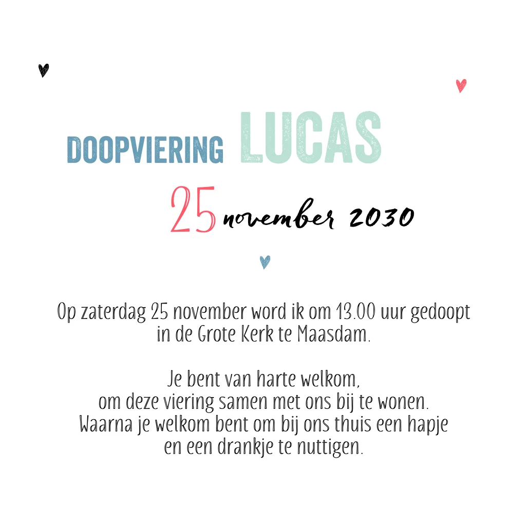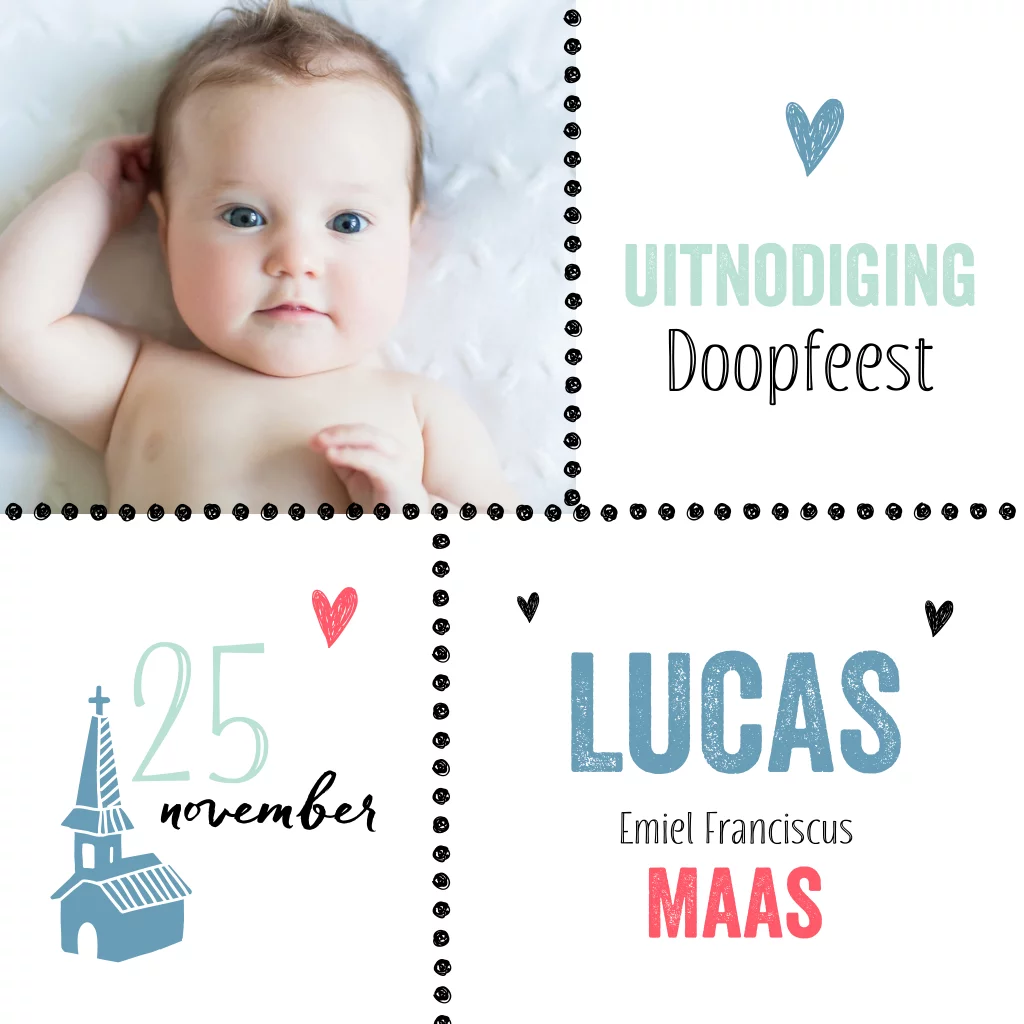 Een hip design met een foto van jullie kleintje en mooie typografie: leuke persoonlijke uitnodiging voor het doopsel.