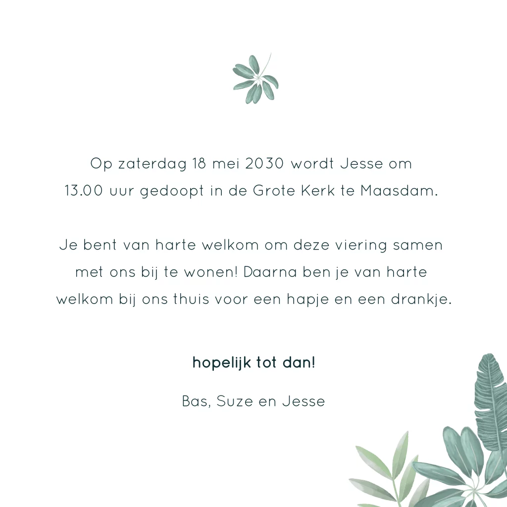 Originele uitnodigingskaart voor het doopfeest van je zoon. Stoer botanisch met takjes en foto.