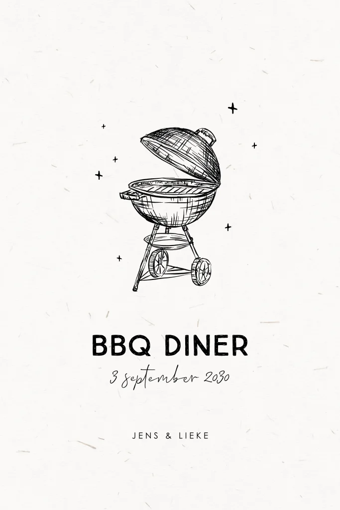 Organiseer je een gezellig tuinfeest met barbecue dan is deze uitnodiging met tekening van de bbq en spetterende sterren er omheen een match! De kaart is in zwart wit met trendy typografie, deze pas je eenvoudig zelf aan in de online editor.