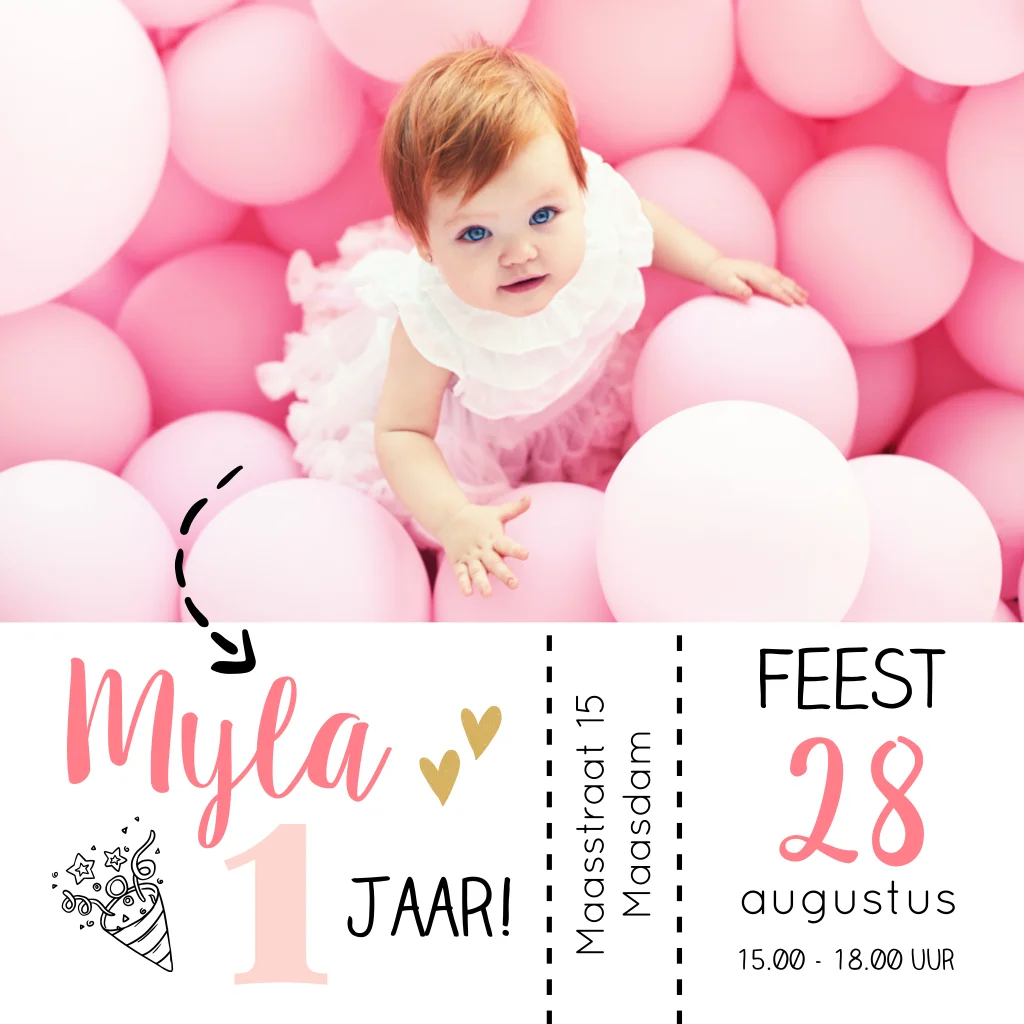 Vrolijke kaart voor een eerste verjaardag. Maak eenvoudig je persoonlijke verjaardagsuitnodiging door de foto te vervangen.