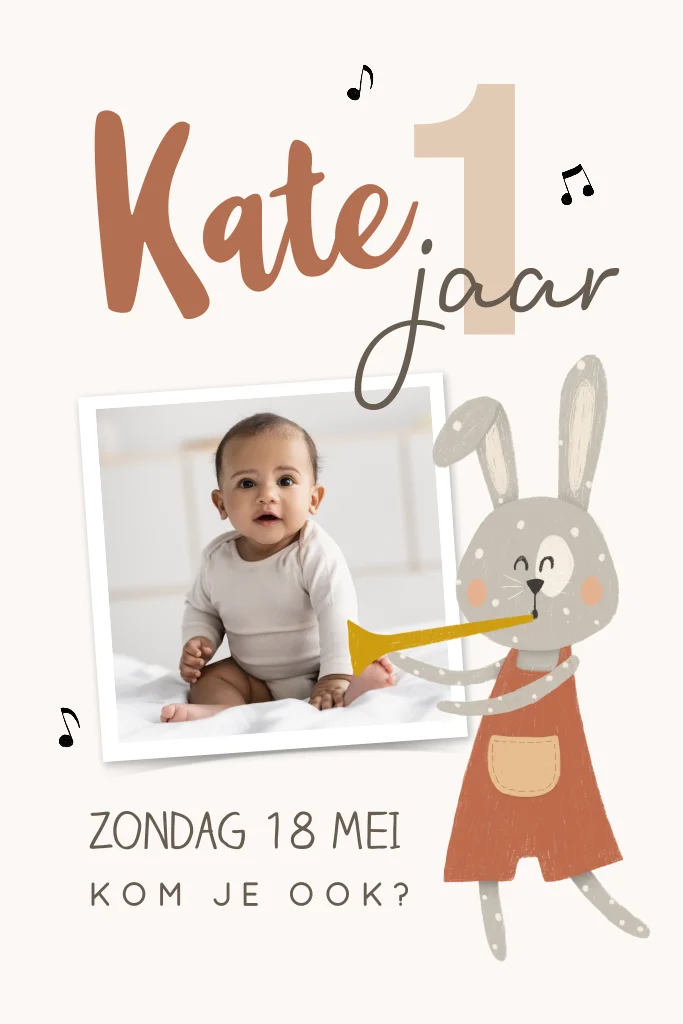 Een originele uitnodiging voor de eerste verjaardag van jouw kindje met een vrolijk haasje. Op de voorzijde is er ruimte voor een foto van de jarige. Maak zo eenvoudig je persoonlijke uitnodiging.