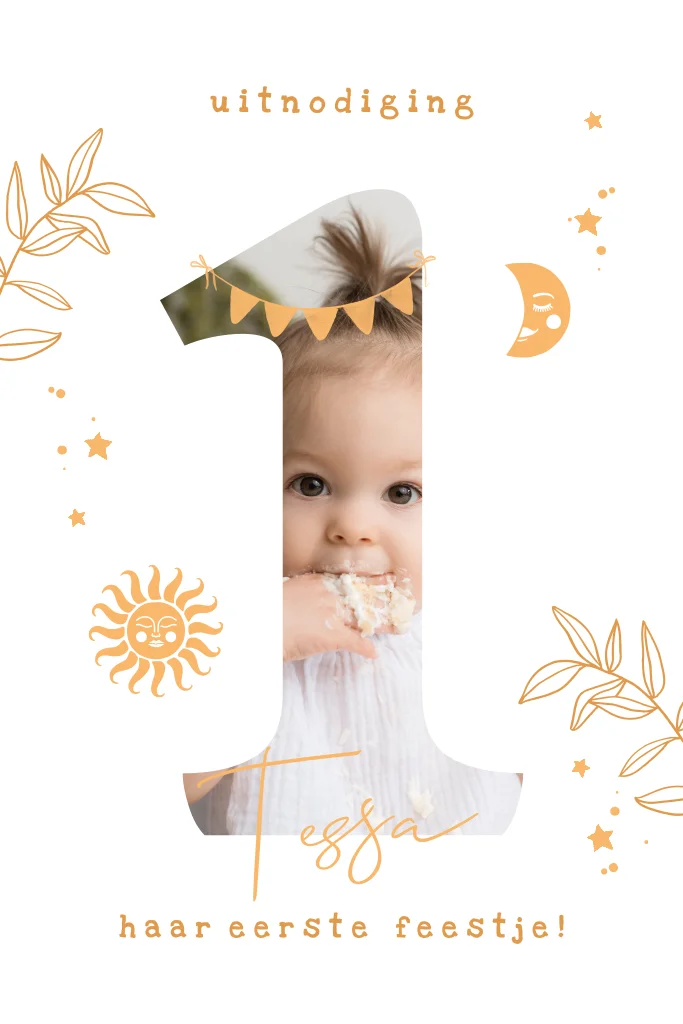 De eerste verjaardag van je kleintje staat voor de deur en dat moet gevierd worden! Nodig vrienden en familie uit met deze mooie uitnodiging met foto van de jarige. De zon, maan en sterren versiering maken de kaart helemaal af. Hiep hiep!