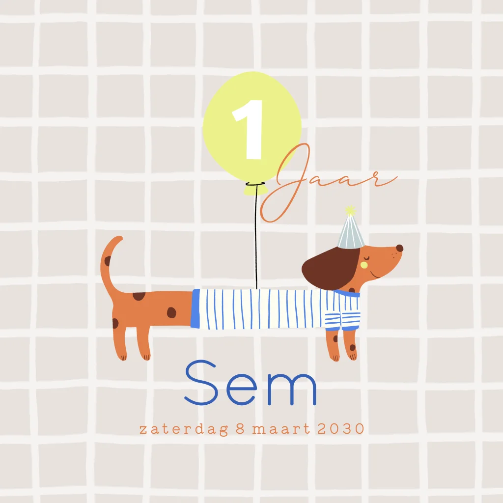 Een originele uitnodiging voor de eerste verjaardag van jouw kindje met een tekkel en ballon in opvallende kleuren.