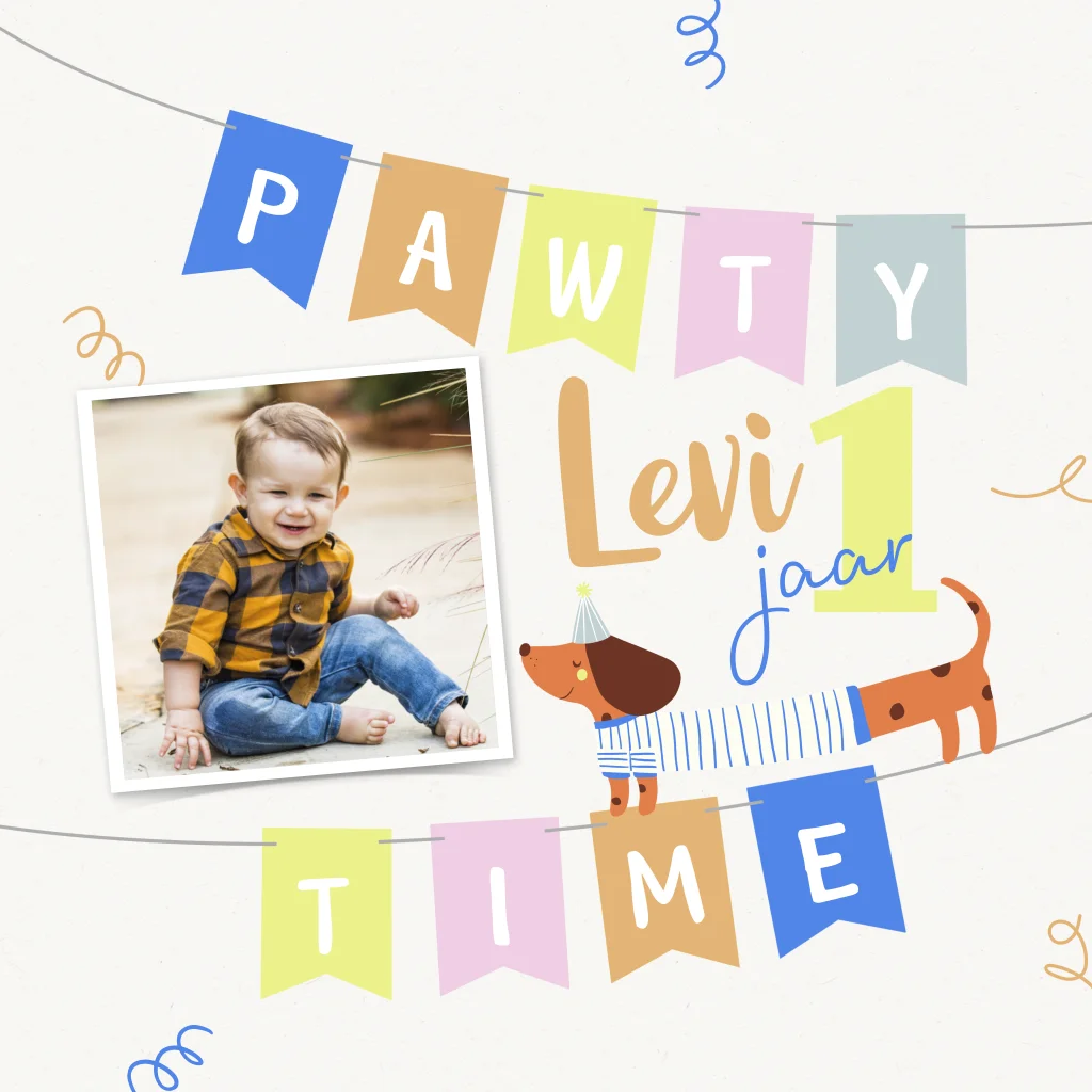 Een originele uitnodiging voor de eerste verjaardag van jouw kindje met een vrolijke tekkel. Op de voorzijde is er ruimte voor een foto van de jarige. Maak zo eenvoudig je persoonlijke uitnodiging.