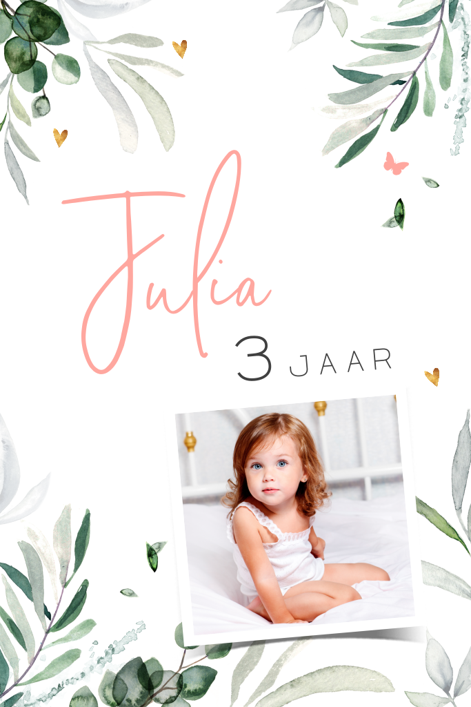 Prachtig geïllustreerd botanisch ontwerp voor het feestje van jullie drie jarige dochter. Met subtiele goudkleurige hartjes, roze vlindertjes en ruimte voor een foto van de jarige jet. Maak het af met een mooie envelop en sluitzegel.