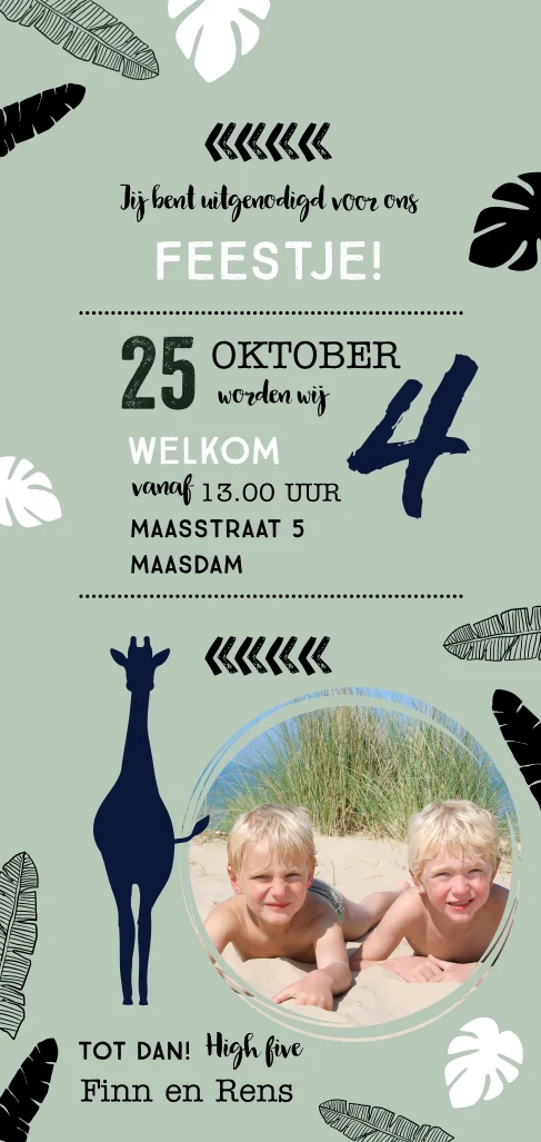 Deze hippe langwerpige uitnodiging is leuk om te versturen voor het kinderfeestje van een tweeling. Mooi geïllustreerd met veertjes, bladeren en een giraffe op een mintgroene achtergrond.