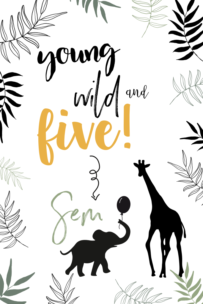 Stoere uitnodigingskaart jongen vijf jaar met tropische elementen, vrolijke typografie, een giraffe en olifant. Maak de uitnodiging compleet met olijfgroene envelop.