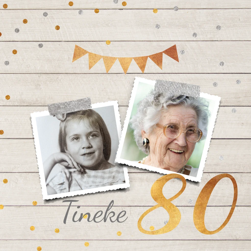 Een feestelijke uitnodigingskaart voor je 80e verjaardagsfeest met hout en confetti in goud en zilver. Extra persoonlijk door de foto's van vroeger en nu.