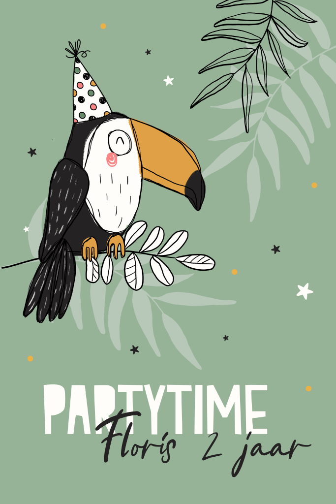 Verjaardagsuitnodiging kinderfeestje twee jaar jungle met vrolijke toekan met feesthoedje.