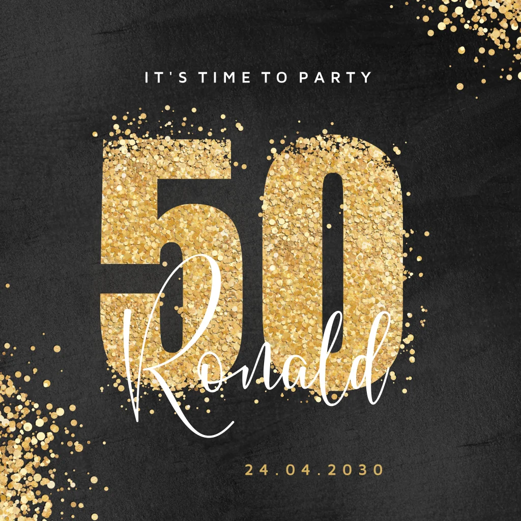 Uitnodiging feestelijk voor een vijftigste verjaardagsfeest in zwart wit met gouden confetti.