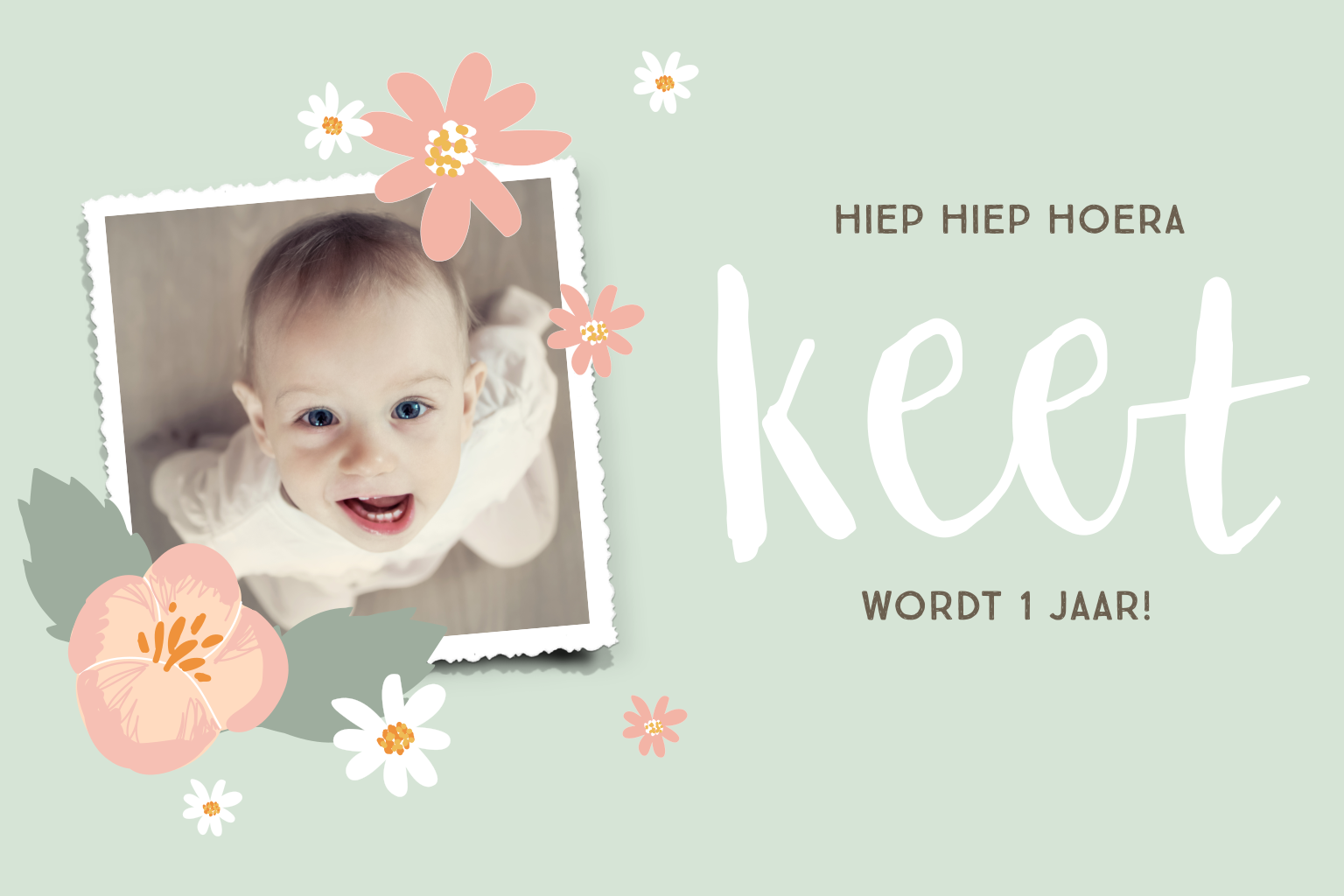 Maak dit lieve kaartje met schattige bloemetjes helemaal eigen met een foto van jullie knappe meisje!