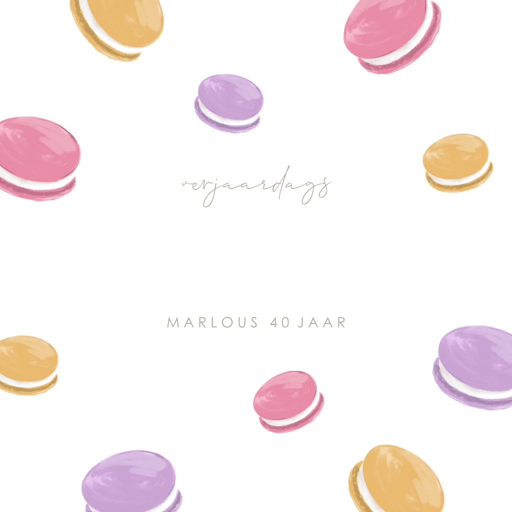 Ook zo'n zin in een verjaardagsfeestje? Met deze vrolijke uitnodiging voor een high tea kan de voorpret beginnen. De tekst 'high tea' staat in luxe goudfoliedruk tussen een patroon van macarons in roze, paars en geel met lieve hartjes ertussen, helemaal hip!