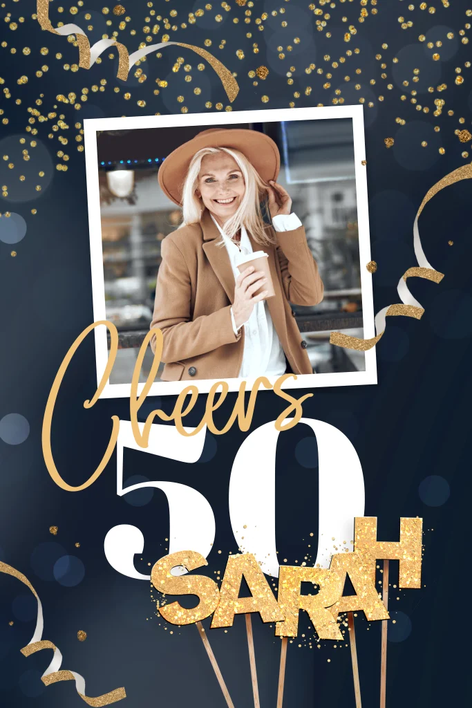 50 jaar, gefeliciteerd! Nodig vrienden en familie uit met deze feestelijke uitnodiging met serpentine, confetti en gouden Sarah letters. Cheers!