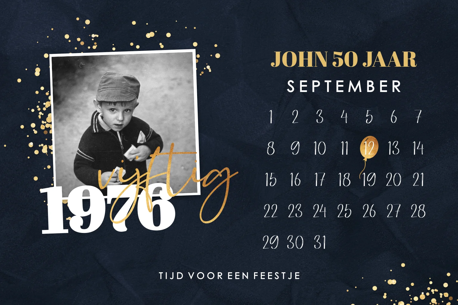 Stijlvolle en feestelijke verjaardagsuitnodiging met kalender voor een 50e verjaardag. Kies heel eenvoudig illustraties, foto's en afbeeldingen uit onze beeldbank. Voeg eigen foto's en tekst toe en maak een unieke kaart. Lees hier onze tips voor het ontwerpen van het kaartje. Vragen? We helpen je graag!