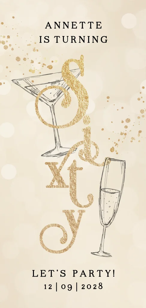 60 jaar, let's party! Nodig vrienden en familie uit voor je zestigste verjaardag met deze feestelijke gouden uitnodiging. Je past gemakkelijk de teksten aan met de online editor.
