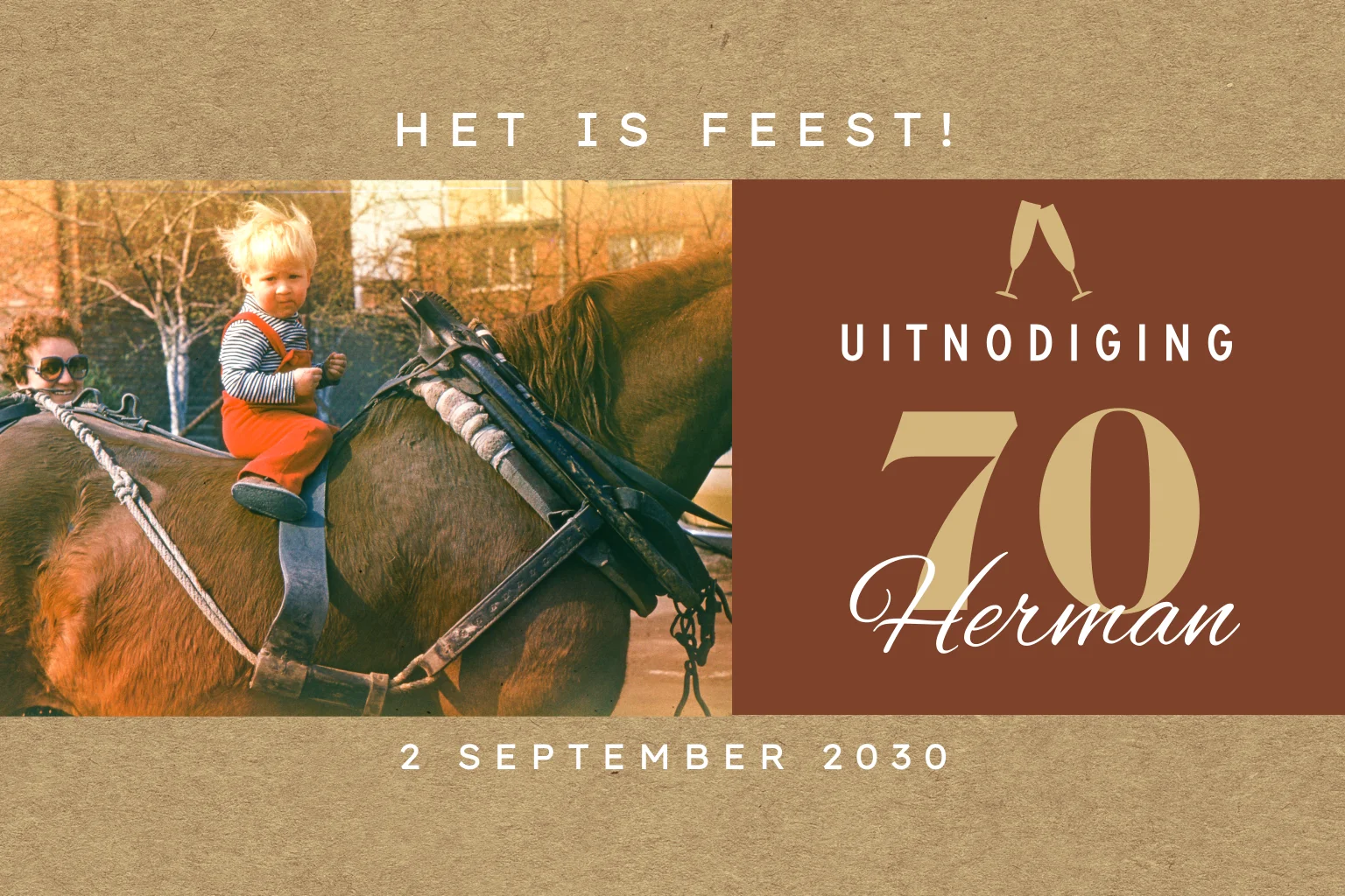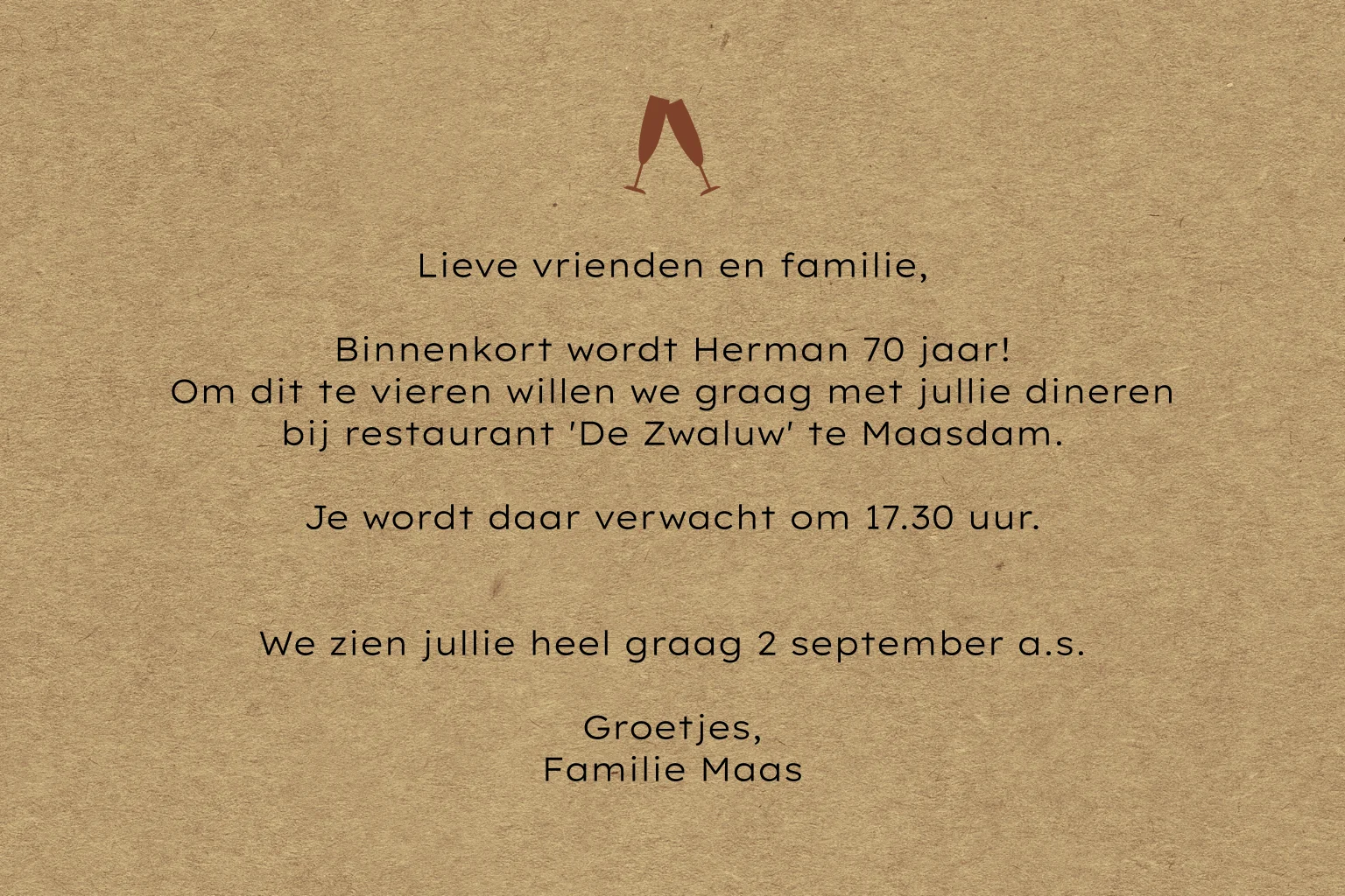 Originele uitnodiging verjaardag 70 jaar met kraft achtergrond en een foto van de jarige.