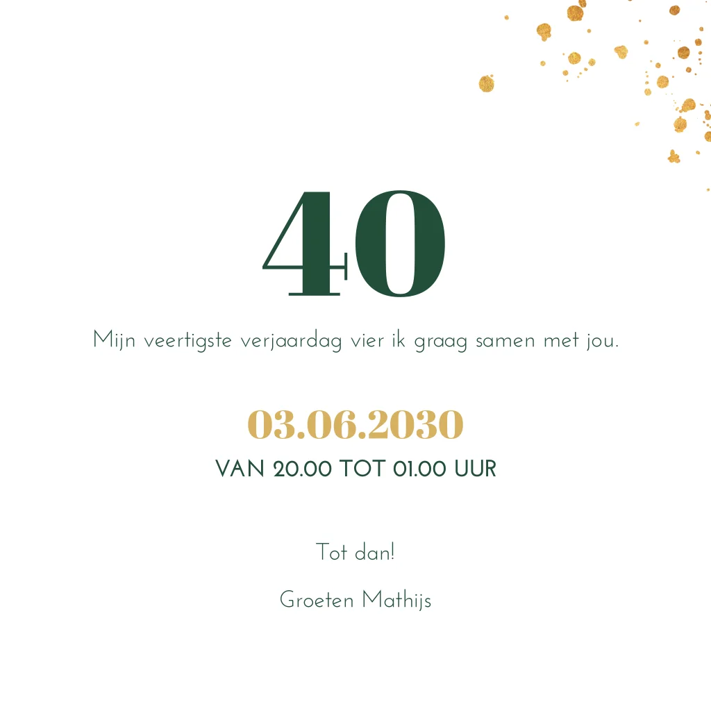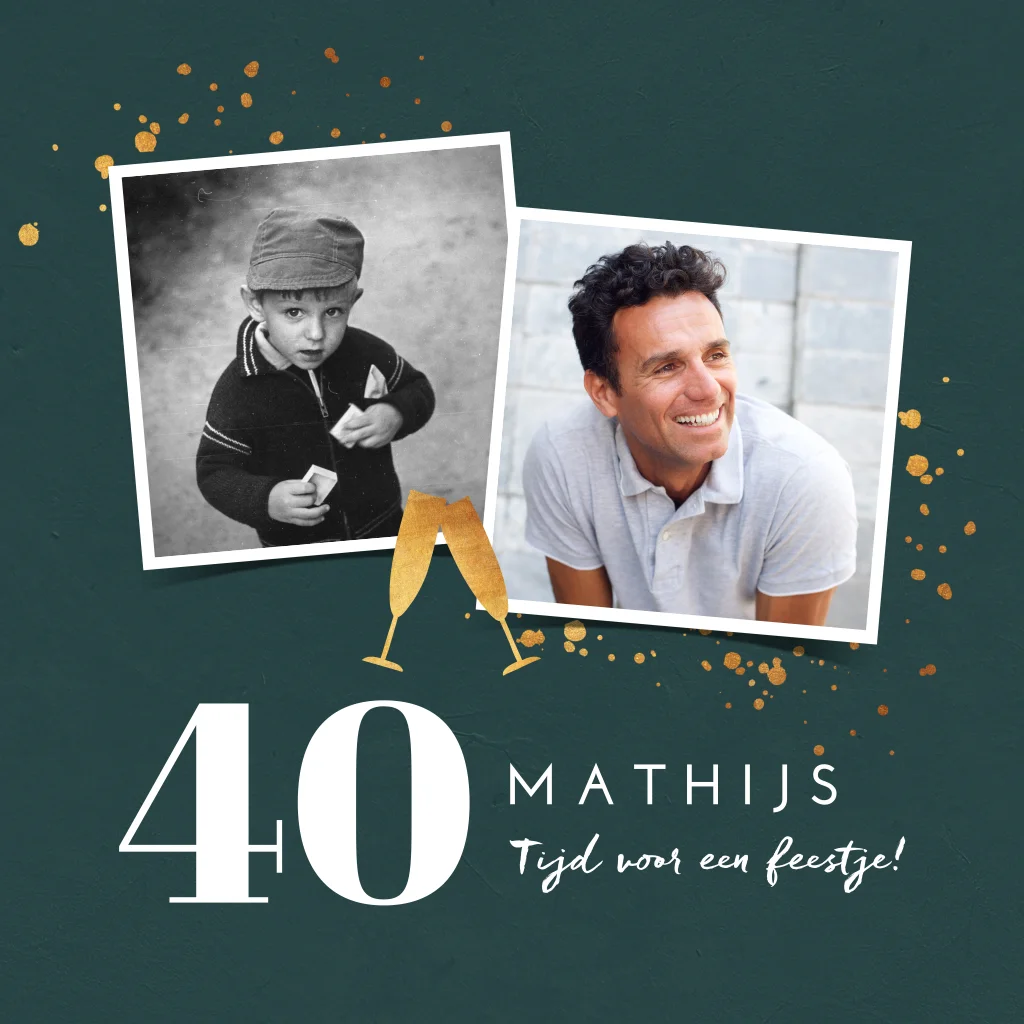 Een stoere uitnodiging verjaardag met vrolijke confetti en proostende glazen in goudlook. Maak de uitnodiging super persoonlijk door op de voorzijde eigen foto's toe te voegen.